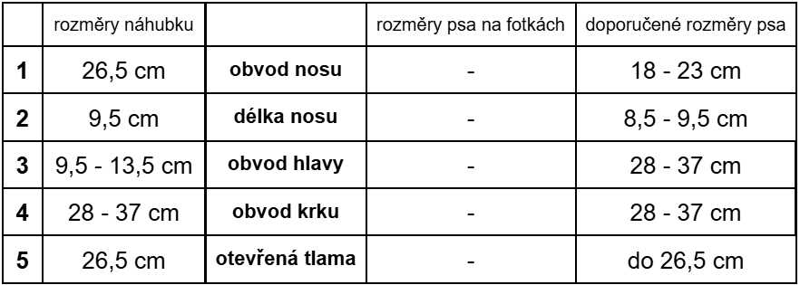 Náhubek má rozměry tak jak je uvedeno v tabulce, univerzální náhubek neupravujeme podle Vašich rozměrů. V tabulce uvádíme také doporučené rozměry, které by měl váš pejsek mít, aby mu náhubek seděl. Pokud jakýkoliv z vašich rozměrů nesedí, doporučujeme zvolit náhubek na míru.