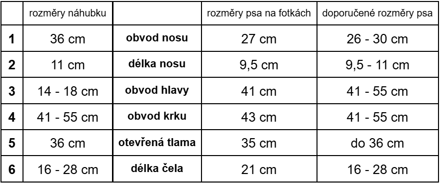 Náhubek má rozměry tak jak je uvedeno v tabulce, univerzální náhubek neupravujeme podle Vašich rozměrů. V tabulce uvádíme také doporučené rozměry, které by měl váš pejsek mít, aby mu náhubek seděl. Pokud jakýkoliv z vašich rozměrů nesedí, doporučujeme zvolit náhubek na míru.