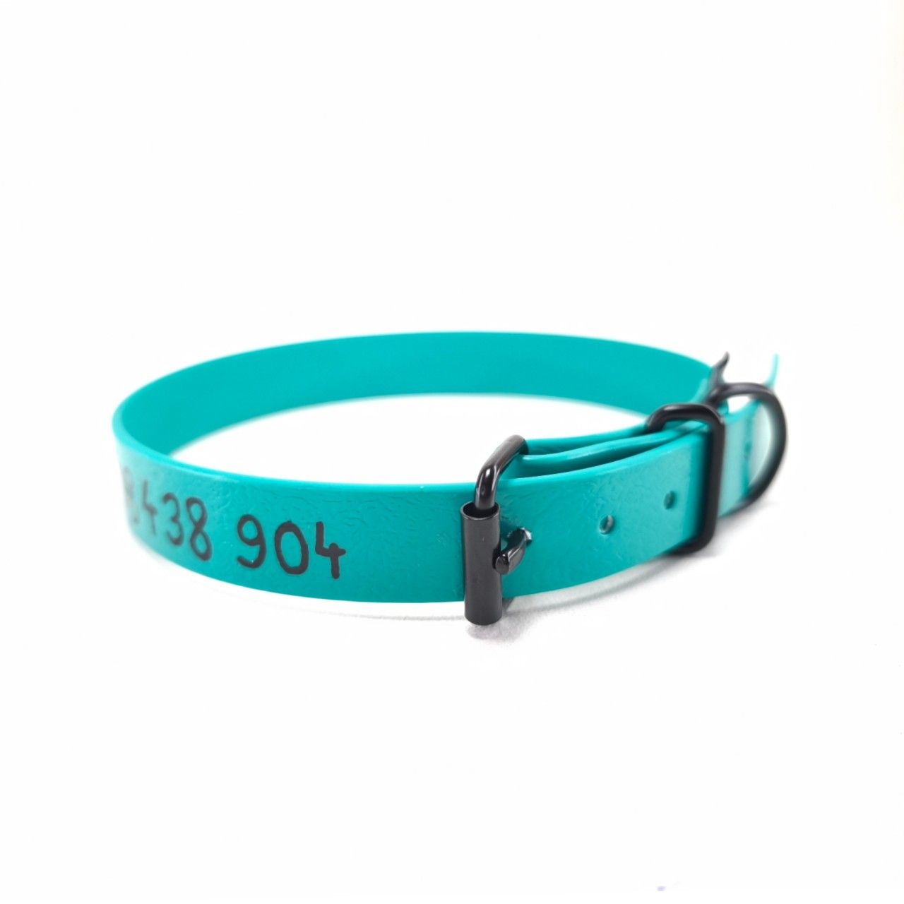 Obojek je vyroben z VODĚODOLNÉHO POPRUHU v šířce 2cm. Voděodolný popruh (také známý pod názvem biothane) je umělý materiál podobný kůži, je ale odolnější a je k dispozici v různých pestrých barvách. Popruhy jsou vyrobeny ze dvou materiálů. Jádro popruhu tvoří PVC tkanina, na kterou je nanesena vrstva termoplastického polyuretanu (TPU). Oproti běžným polypropylenovým popruhům se vyznačují mnohem větší odolností. Popruhy se neodírají, nevytahují, 100% odolávají vodě a bakteriím.