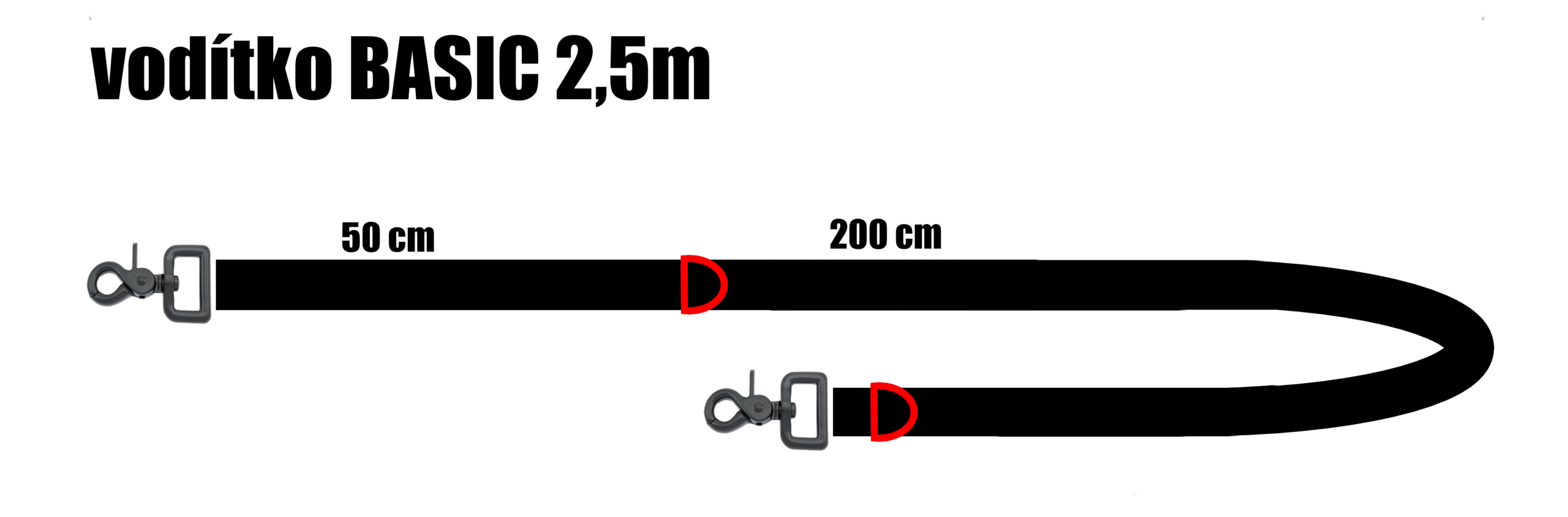 Přepínací vodítko má dvě karabiny. Délka vodítka od jedné karabiny k druhé je 2,5m. Vodítka mají 2 kroužky, které umožňují přepínat délku podle potřeby. Jeden kroužek je umístěn přímo u karabiny, druhý ve vzdálenosti 0,5m od druhé karabiny.