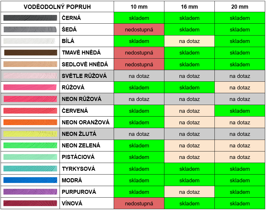 Pokud máte zájem o barvu nebo šířku, kterou nemáme skladem, je to možné za příplatek 100 Kč / barva. Stačí když nám napíšete vaši představu. Šířky jsou možné pouze 10, 16 a 20 mm. Některé barvy jsou ale dostupné jen v některých šířkách.